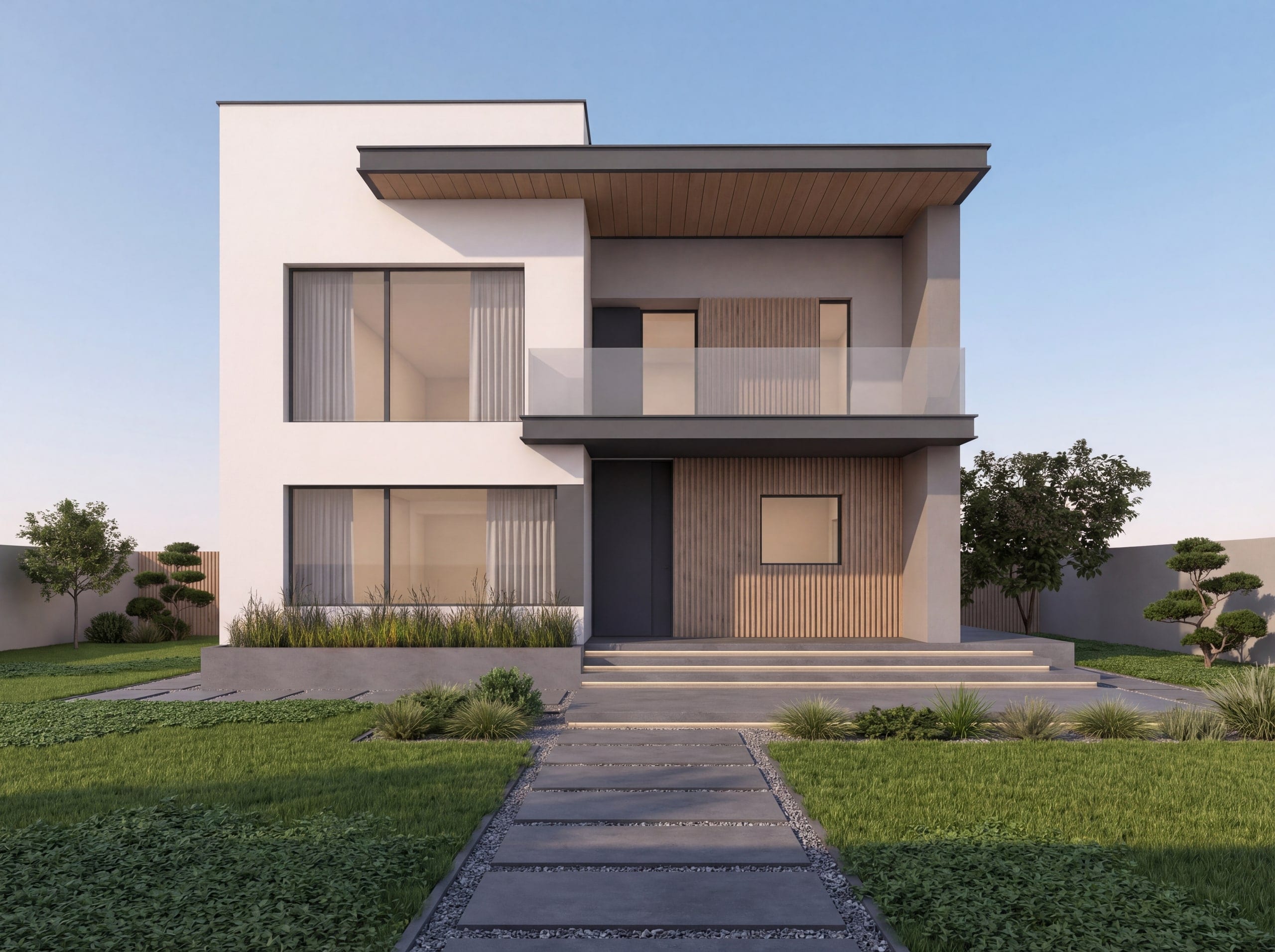 Volum simplu, prezent pe un lot primitor din Simnic. Locuinta pune accentul pe proportie si materialitate controlata — o fatada principala cu linii ferme, console orizontale bine calibrate si accente din lemn care ridica expresia fara sa agite.